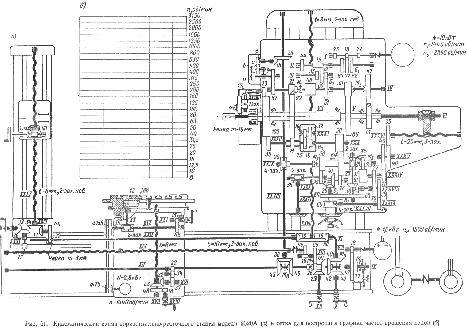 · Рисунок 6.13 Кинематическая схема станка 2620А (а) и сетка для