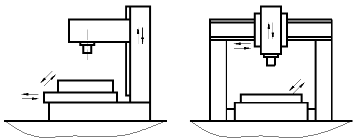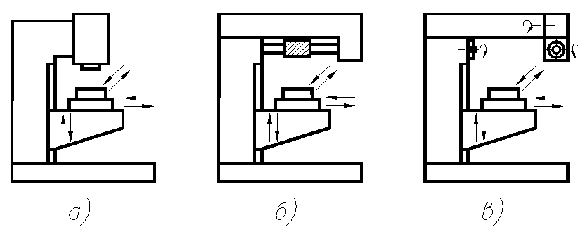 По расположению оси шпинделя плоскошлифовальные станки подразделяются на горизонтальные (рис. а и в), работающие периферией круга и на вертикальные (рис. б и г), работающие торцом круга.