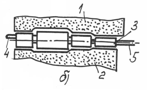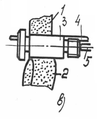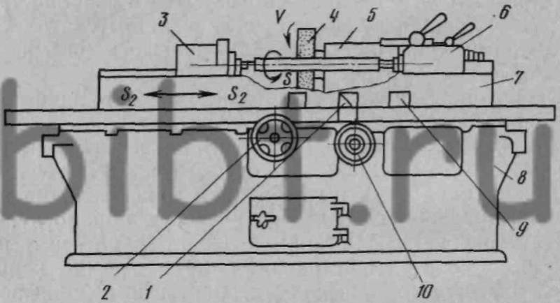 Недлинные заготовки сложной формы шлифуют методом врезания поперечным перемещением ведущего круга 2 (рис. в). При этом в осевом направлении заготовка 3 фиксируется упорами 5, к которому поджимается за счёт небольшого (порядка 30”) поворота оси ведущего круга 2.