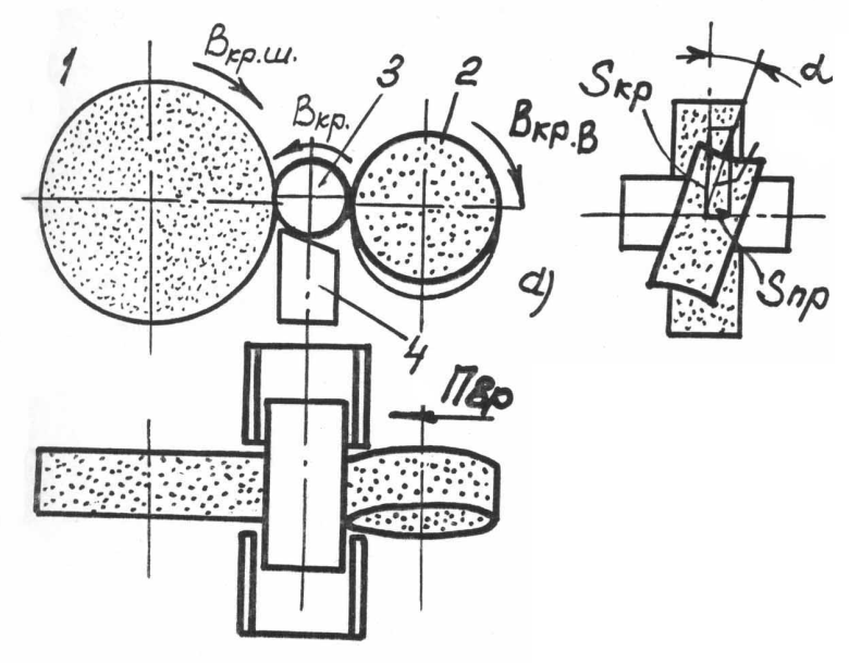 вом производстве для наружного и внутреннего шлифования тел вращения. (Рис. 8.4). При шлифовании наружных поверхностей заготовка 3, поддерживаемая ножом 4, располагается между двумя абразивными кругами из которых шлифу-емый круг 1, вращаясь с окружной скоростью 30…40 м/с, снимает с заготовки припуск, а другой ведущий круг 2, вращающийся с окружной скоростью 10…50 м/мин, сообщает заготовке вращение (круговую подачу) VSкр и продольную (осевую) подачу Ппр. Установочное поперечное перемещение ведущего круга Пвр определяет диаметр шлифуемой детали. Ось ведущего круга 2 поворачивает на угол α, чтобы он не только вращая заготовку VSкр, но и выполняя её осевую подачу Ппр. При черновом шлифовании α = 1,5…6º, при чистовом α = 0,5…1,5º.