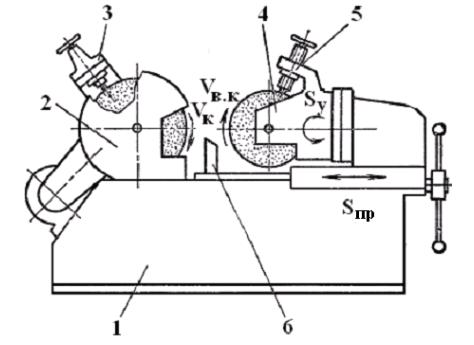 2, 4 – бабки; 3, 5 – механизмы для правки кругов; 6 – нож.