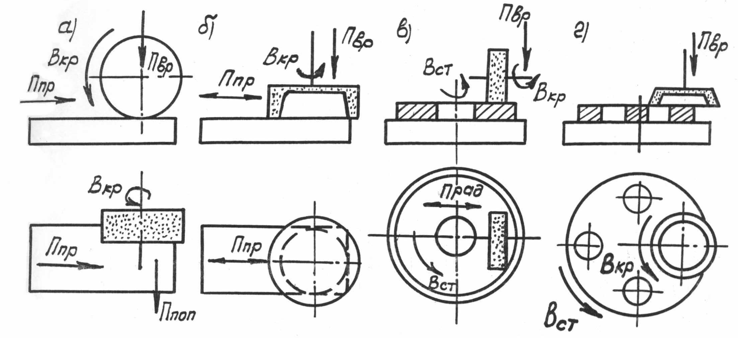 Главное движение резания у всех разновидностей – вращение шлифовального круга Vкр. При прямоугольном столе имеется его продольное возвратно-поступательное движение Ппр, при круглом – вращение стола Vст. При работе дисковым кругом на станках с горизонтальным шпинделем имеется периодическая поперечная подача Ппоп вдоль оси шпинделя для обработки заготовок по всей их ширине.
