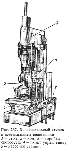 Хонинговальные станки могут иметь горизонтальное или вертикальное расположение шпинделя, совершающего вращательное движение резания v и возвратно-поступательное движение продольной подачи v s относительно обычно неподвижной заготовки. Станки имеют много общего со сверлильными станками.