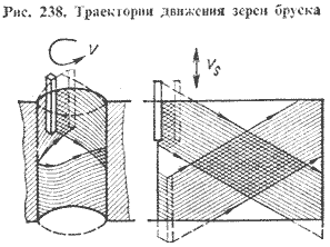 Хонинговальная головка (хон, хона) представляет собой инструмент, состоящий из металлической конструкции, несущей абразивные или алмазные бруски, расположенные по окружности (рис. 236). Эти бруски принудительно, специальным механизмом головки раздвигаются по радиусам постепенно за каждый ход увеличивая обрабатываемый диаметр отверстия. Зерна бруска при хонинговании образуют неповторяющиеся пересекающиеся винтовые траектории (Рис. 8.17), что способствует получению поверхности с высокими эксплуатационными свойствами.