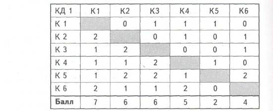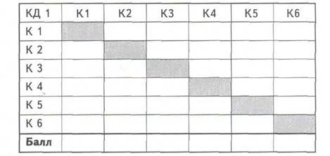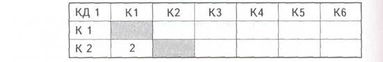 Клетки по диагонали заштрихованы, так как компетенции не могут сравниваться сами с собой. Дальше начинается сравнение. Вначале компетенция 1 (К1) сравнивается с компетенцией 2 (К2) путем постановки вопроса: «Для успеха в этой ключевой деятельности, что важнее иметь работнику для успеха в этой ключевой деятельности - компетенцию 1 или компетенцию 2?» Если К1 - более важна, то она получает балл 2; если обе компетенции одинаково важны, то К1 получает балл 1; если менее важна, то К1 получает балл 0. Важно, чтобы каждый раз, когда задается вопрос, первая компетенция, к которой он обращается, находилась выше, а сравнение необходимо проводить с компетенциями, расположенными рядом. То есть компетенция, с которой сравнивают, должна располагаться по боковой оси - иначе произойдет большая путаница. Балл помещается в соответствующей ячейке, ниже компетенции, упоминаемой первой (для которой и выставляют балл). Например: если К1 в конкретной ключевой деятельности КД1 важнее К2, то балл 2 надо поставить в решетке таким образом: