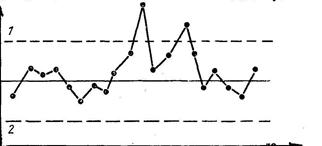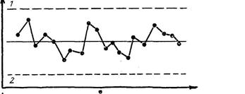 Контрольная карта – это разновидность графика, однако она отличается от обычного графика наличием линий, называемых контрольными границами или границами регулирования. Эти контрольные границы обозначают ширину разброса, образующегося в обычных условиях течения процесса. Если все точки на графике входят в область, ограниченную контрольными границами, это указывает на то, что процесс протекает в относительно постоянных условиях, т. е. на стабильность процесса. И наоборот, если на графике есть точки, выходящие за пределы контрольных границ, значит, в ходе процесса возникли погрешности, нарушившие его стабильность. Это можно проиллюстрировать следующими графиками (рис.6, 7):