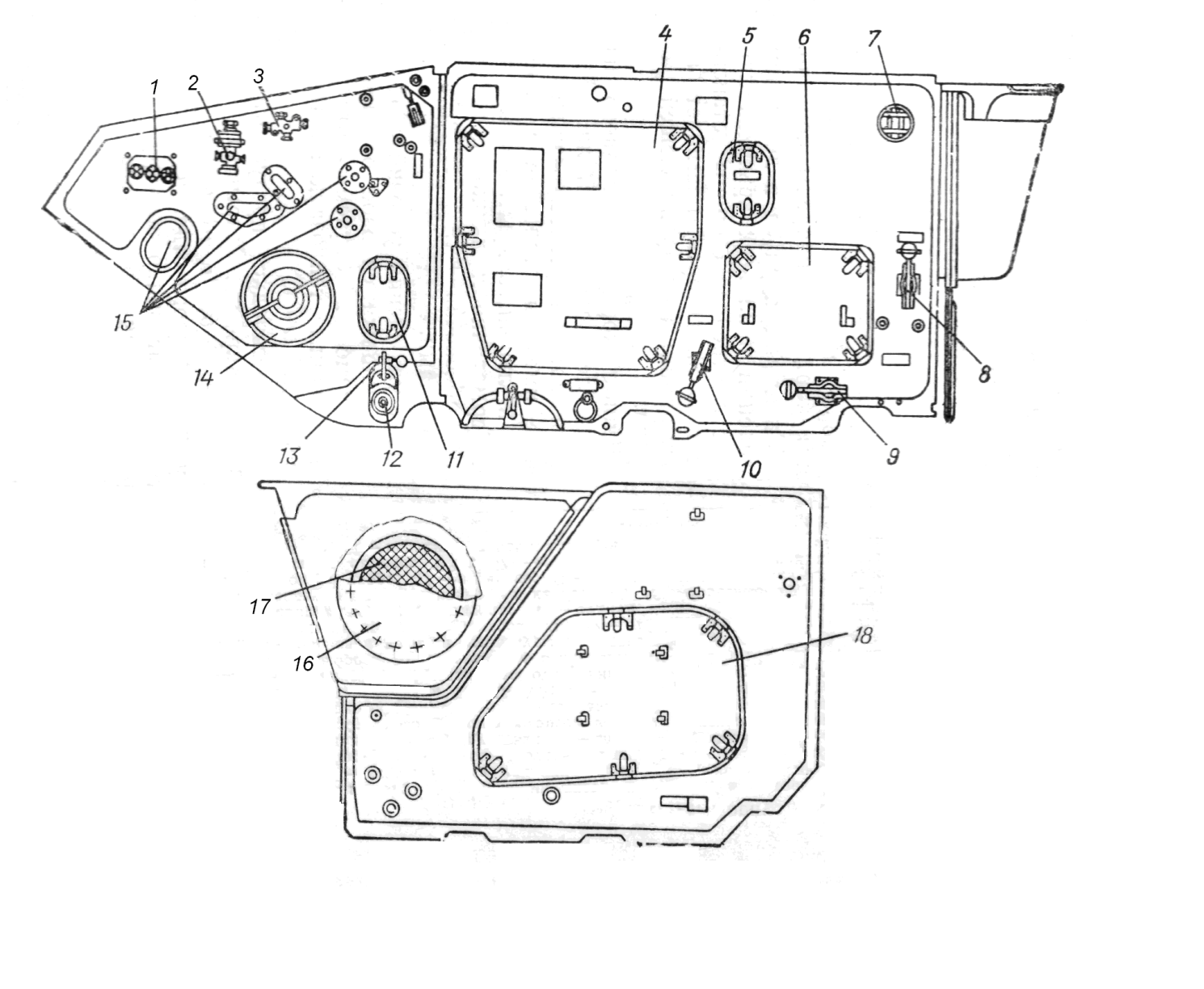 1 – крышка для установки проходных разъемов; 2 – редуктор давления; 3 – переходная коробка; 4, 5, 6, 11, 18 – крышки люков для доступа в силовое отделение; 7 – плафон; 8 – рукоятка заслонки подогревателя; 9 – кран топливной системы; 10 – кран слива воды из двигателя; 12, 14, 15 – места прохода тяг приводов и валов; 13 – клапан слива воды из отделения управления в силовое; 16 – крышка лючка для доступа к защитной сетке воздухоочистителя; 17– защитная сетка