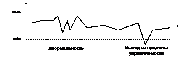 На приведенном примере видно два случая анормальности процесса. В первом случае наблюдается хаотичное колебание температуры, однако при этом значения температуры остаются в пределах требуемых значений. Во втором случае анормальность процесса привела к нарушению требуемых параметров, и после корректировки процесс вошел в требуемые пределы.