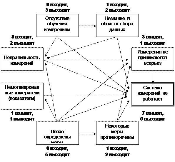 В результате анализа построенного графа, в соответствии с количеством стрелок, были выделены причины, по которым внедренная системы измерения показателей не оправдала надежд руководства.