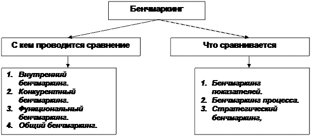 Таким образом, бенчмаркинг предполагает сравнение своего предприятия с другими предприятиями. Можно определить разные типы бенчмаркинга в зависимости от того, с кем проводится сравнения и что сравнивается.