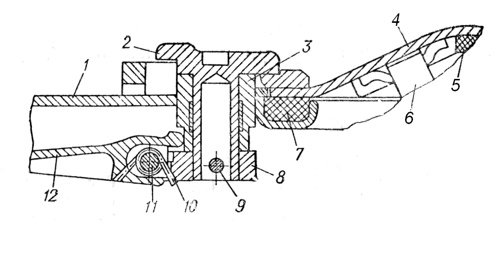 6 – ручка; 7 – уплотнение; 8 – кронштейн; 9 – палец; 10 – пружина; 11 – валик;