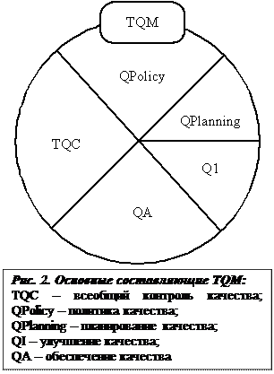 Концепция TQM базируется на том, что в современных условиях решение проблемы качества все больше определяется человеческим фактором, то есть отношением людей к делу и отношением руководителей к персоналу. Главная задача руководства – инициирование творческого потенциала работников в определённом направлении. При этом концепция TQM опирается на такие понятия, как фирменная (корпоративная) культура, стиль руководства, демократизация управления. Концепция ставит качество в центр всей производственной деятельности, предопределяющей удовлетворение требований потребителя и, как следствие, улучшение экономического и социального положения предприятия.
