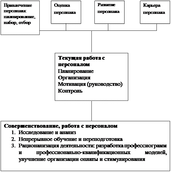 | Третий уровень работа с персоналом руководителей подразделений фирмы. | 1. Оценка сотрудника при приеме на работу, адаптация нового сотрудника. 2. Контроль за обучением сотрудников. 3. Аттестация и оценка деятельности. 4. Поощрение и мотивация персонала. 5. Информирование об итогах работы подразделения. 6. Создание своего кадрового резерва. | 1. Менеджеры (помощники) по кадрам у руководителей. 2. Кураторы профессиональных кадровых служб. 3. Смета расходов (премирование, социальная поддержка, направление на обучение и стажировку). |