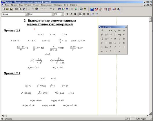 При записи функций необходимо уяснить, как они обозначаются в Маткаде (вызываются кнопкой f(x)). Результаты выполнения указанных математических операций приведены в примерах 2.1 и 2.2 на рисунке 6.1.
