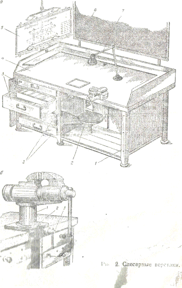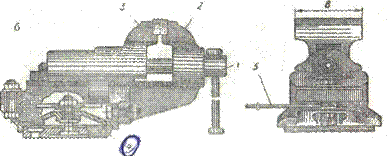 Поворотные тиски (рис. 3, б) имеют основание 4, на которое устанавливается поворотная часть с подвижной и неподвижной губками. Она может поворачиваться относительно вертикальной оси. Нужное положение фиксируется рычагом 5. Попоротые тиски позволяют выполнять работы универсального характера и поэтому получили наибольшее распространение.