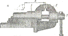 Неповоротные тиски (рис. 3, а) состоят из неподвижной части 2, по направляющим которой с помощью винта 1 может перемещаться подвижная часть 3. Заготовка зажимается сакрепленными на губках рифлеными планками.