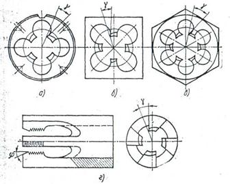 Рис. 16. Типы резьбонарезных плашек:а — круглая; 6 — квадратная; в — шестигранная;