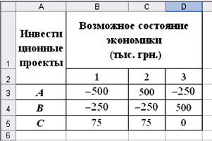 Задача. Рассматриваются три проекта относительно инвестирования: А, В, С. По прогнозам аналитиков в будущем возможен один из трех вариантов развития экономики (три состояния экономики) с вероятностями: