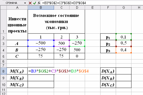 2. В качестве показателя количественной оценки эффективности проектов вычислим в табличном процессоре ожидаемые значения чистой теперешней стоимости (NPV) проектов, то есть математические ожидания случайных величин