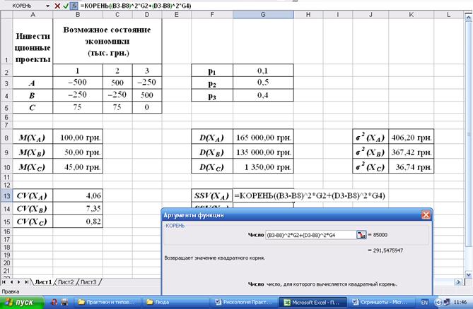 Для проекта А значение среднеквадратичного отклонения больше всего, то есть и степень риска наибольшая. Для проекта С - значения среднеквадратичного отклонения меньше всего, то есть и степень риска наименьшая. Что касается проекта В, то мы видим, что значение среднеквадратичного отклонения для этого проекта в десять раз больше, чем для третьего, хотя ожидаемые значения чистой теперешней стоимости отличаются несущественно. И, напротив, хотя ожидаемые зачения чистой теперешней стоимости первого и второго проектов отличаются в два раза - значения среднеквадратичного отклонения отличаются несущественно.