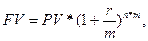 В финансовом анализе под стандартным временным интервалом принято рассматривать один год (360 дней). В том случае, если дополнительно оговаривается частота выплаты процентов по вложенным средствам в течение года, формула расчета будущей стоимости инвестиционного капитала может быть представлена в следующем виде: