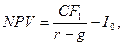На практике встречаются варианты инвестирования в проекты со сроком реализации более 40 лет и постоянным темпом изменения годовой величины чистых потоков (g). В этой ситуации для расчета NPV можно использовать следующую формулу: