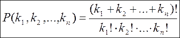 . Перестановкой с повторениями состава (k1, k2,…,kn) называется упорядоченная выборка, в которой k1 раз встречается элемент х1, k2 раз встречается элемент х2 и т.д. Общее число таких перестановок обозначается P(k1, k2,…,kn). Справедлива формула