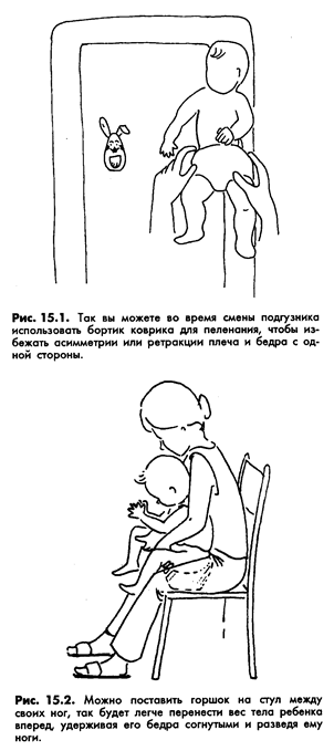 спастической гемиплегией (когда нарушения движений есть только в одной половине тела). Можно избежать асимметричного положения во время смены подгузника, если использовать коврик для пеленания с полукруглым вырезом в середине и приподнятым бортиком по сторонам. Вы можете положить ребенка так, чтобы рука и нога на спастичной стороне тела, которые находятся в ретракции (то есть смещены назад), лежали на бортике (рис. 15.1).