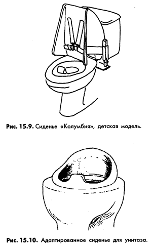 Приспособления следует подбирать с учетом индивидуальных потребностей вашего малыша. Мы же просто расскажем о том, что кажется удобным многим родителям. Для старших детей, которым нужна дополнительная поддержка, мы рекомендуем специальное сиденье «Колумбия» (детскую модель). У такого приспособления есть пластмассовая спинка, которая по форме соответствует спине ребенка, высоту спинки можно менять, и все сиденье легко снимается с унитаза (рис. 15.9). Для того чтобы дополнительно зафиксировать ребенка, можно использовать ленты из широкой тесьмы, отрегулировав их длину. Величина отверстия унитаза уменьшается за счет детского пластмассового сиденья с передней стенкой, которая защищает от брызг. Кроме этого, можно приобрести подлокотники и пластмассовую подставку для ног, высота которой легко меняется.