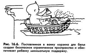 Многие маленькие дети с умеренно выраженной спастичностью чувствуют себя небезопасно в большой ванне, хотя и способны удерживать равновесие в положении сидя. Если у ванны скользкое дно, обычный коврик с присосками, который «приклеивается» ко дну ванны, поможет ребенку чувствовать себя увереннее. Иногда маленькие дети чувствуют себя лучше, если кроме коврика положить в ванну два надувных круга и посадить малыша в середину (рис. 16.5). Эта, казалось бы, совсем небольшая поддержка обеспечивает безопасность, не ограничивая движений. Другой способ помочь малышу чувствовать себя увереннее в ванне и в то же время не мешать ему двигаться и играть – посадить его в пластмассовую корзину для белья. Чтобы корзина не скользила, на дно ванны тоже кладется резиновый коврик. Можно прикрепить к ванне присасывающуюся резиновую ручку, продев ее сквозь отверстия корзины. Если ребенок недостаточно хорошо удерживает равновесие, он сможет держаться за нее (рис. 16.6).