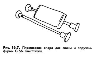 Для маленького ребенка, который хорошо контролирует положение головы и туловища, но не очень хорошо сохраняет равновесие сидя, мы рекомендуем пластиковые опоры для спины и поручни фирмы G.&S. Smirthwaite. У этих приспособлений легко меняется ширина, поэтому их легко крепить присосками к обычной ванне. Сама спинка из пластика крепится к одной из перекладин и ее можно повернуть так, чтобы ее наклон соответствовал естественному наклону спины (рис. 16.7). Скамеечка из реек для ванны этой же фирмы может использоваться вместе с поручнем так, как показано на рисунке, или вместе со спинкой. Эта же компания выпускает пластмассовые угловые стульчики для детей от 6 месяцев до 5 лет (рис. 16.8). Ребенок пристегивается ремешками на липучках и, если нужно, дополнительными ремешками с пряжками. К стульчику прилагается пластмассовый цилиндр, который прикрепляется к сиденью, чтобы ноги ребенка были разведены.