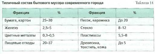 Состав ТБО в современных городах разных стран достаточно близкий. Основными фракциями (составляющими, компонентами) являются бумага, органические остатки и стекло (табл. 14).