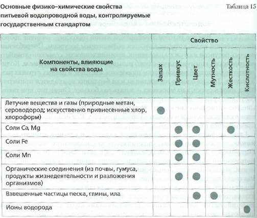 В России, как и везде в мире, существуют государственные стандарты качества питьевой воды. В соответствии с ними необходимо, чтобы водопроводная питьевая вода удовлетворяла определенным гигиеническим требованиям. Чистая вода — не значит без примесей. Обычно она содержит более двухсот различных ионов, микроскопические неорганические и органические частицы, живые микроорганизмы, летучие вещества и газы. Но вода должна быть безопасной по химическому составу и обладать благоприятными физическими характеристиками (табл. 15).