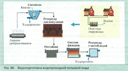 Путь природной воды в наши дома обычно начинается с обложенной камнями трубы на дне водоема — с оголовка. Камни не дают попасть в водозаборную трубу крупным предметам, увлекаемым по дну течением. Вода поступает на очистную станцию (рис. 80), где ее обеззараживают, добавляют коагулянты (вещества, вызывающие слипание взвешенных частиц) и выдерживают при постоянном перемешивании. Затем отстаивают. После выпадения осадка фильтруют для удаления примесей и, если нужно, умягчают, осаждая соли магния и кальция, устраняют избыток других ионов, растворенные газы. Потом снова обеззараживают. По окончании цикла водо-подготовки вода не содержит ни вредных микроорганизмов, ни органических веществ, ни взвешенных примесей. Но в ней остается хлор (если воду