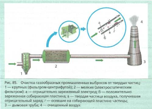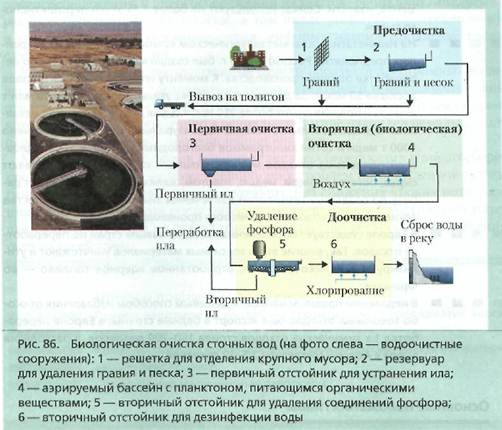 Важную роль в уменьшении загрязнения биосферы промышленными отходами играют очистные сооружения. Их функция — улавливать загрязняющие вещества, которые можно затем переработать или захоронить. Современные очистные сооружения представляют собой системы устройств, которые очищают газообразные выбросы заводов, фабрик, тепловых электростанций (рис. 85) и загрязненные воды — промышленные или бытовые стоки (рис. 86).