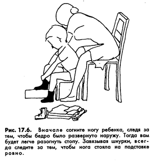 Вначале согните ногу, следя за тем, чтобы бедро было развернуто наружу. Тогда вам будет легче разогнуть стопу. Завязывая шнурки, всегда следите за тем, чтобы нога стояла на подставке ровно (рис. 17.6).
