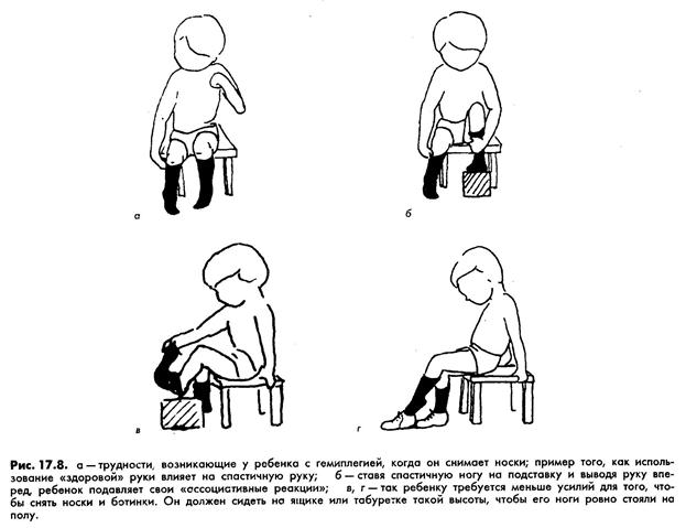 Я часто использую специальные упражнения, которые помогают детям освоить основные компоненты движений, необходимых для того, чтобы брать предмет рукой и придвигать его к себе или отодвигать. Позже дети используют эти движения при одевании и раздевании. Упражнения для маленьких детей показаны на рис. 17.9 и 17.10, а-г, а для старших детей – на рис. 17.11 и 17.12, а-д.
