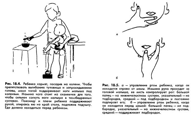 Если ребенок не может контролировать мышцы рта, управлять ими придется вам. Для этого используют два пальца – указательный и средний. Самый главный – средний палец. Положите его снизу под подбородок и с постоянным усилием надавливайте на него – так вы не дадите языку выдвинуться вперед и поможете ребенку правильно глотать. На рис 18.5, б показано, как контролировать рот, если малыш сидит перед вами, а на рис 18.5, а – если он сидит справа от вас (управляющая рука «обнимает» голову ребенка). Возможно, когда вы впервые попытаетесь управлять ртом малыша, ему это не понравится, – дайте ему привыкнуть. Не запрокидывайте ему голову назад, установите ее прямо и следите за тем, чтобы шея тоже была прямой. Скоро вы заметите, что малыш принимает вашу помощь.