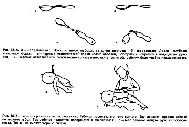 Следите за тем, чтобы ложка не была слишком глубокой, так малышу будет трудно снимать губами пищу. Если она слишком длинная и у нее острый конец, то это может вызвать рвотный рефлекс (рис. 18.6, б). Ребенку с церебральным параличом ложку надо всегда подносить спереди и она обязательно должна располагаться по средней линии его тела, ни в коем случае не сбоку.