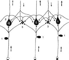 Периферический чувствительный нейрон (1), передающий центростремительные импульсы как на афферентные нейроны (2) с длинным аксоном, так и на специальные переключательные нейроны (3) с коротким аксоном. Наряду с восходящими проводниками (стрелки вверх) показаны нисходящие центробежные проводники (стрелки вниз).