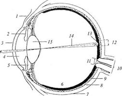 1 – конъюктива; 2 – радужная оболочка; 3 – роговица; 4 – передняя камера; 5 – задняя камера; 6 – стекловидное тело; 7 – склера; 8 – сосудистая оболочка; 9 – сетчатка; 10 – зрительный нерв; 11 – слепое пятно; 12 – желтое пятно; 13 - центральная ямка; 14 – зрительная ось; 15 – хрусталик.