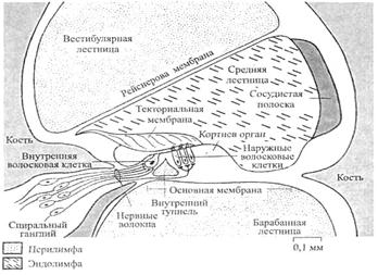 Рис. 2.2. Поперечный разрез одного из витков спирали улитки (по Р. Шмидту и Г. Тевсу, 1985).