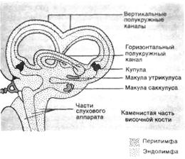 Таким образом, адекватным раздражением для полукружных каналов являются угловые ускорения и замедления, возникающие при вращении человека или животных в горизонтальной, фронтальной или сагиттальной плоскостях, а также смена направления движения, если даже скорость его остается постоянной. Отолитовый же аппарат воспринимает как раздражения от ускорения или замедления прямолинейного движения, так и изменения в положении головы, вызывающие смещение отолитовой мембраны.