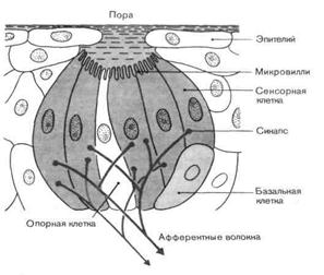 Вкусовые сенсорные клетки – наиболее короткоживущие эпителиальные клетки организма. Продолжительность их жизни составляет всего 10 дней, после чего из базальных клеток формируются новые рецепторы, т.е. базальные клетки являются резервом вкусовых рецепторов. На апикальном конце рецепторов имеется 30-40 тончайших микроворсинок (миковиллий), выходящих во вкусовую ямку, образованную верхушками вкусовых клеток. Эта ямка является началом вкусовой поры, через которую диффундируют молекулы химических веществ. Пора постоянно заполнена слизью, что обеспечивает растворение вкусового вещества и его последующую детекцию микроворсинками.
