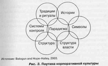 Почему же корпоративная культура часто выступает основным препятствием, «тормозом» перемен в организации. Корпоративная культура нематериальна и представляет собой набор ценностей, символов, приемлемых форм поведения, табу, которые очень трудно формализовать, закрепить, а еще труднее заставить сотрудников следовать этим неписаным правилам (рис. 3).