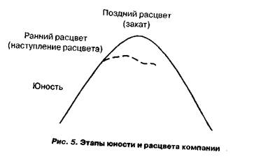 Если компании удается успешно пройти этап юности, она вступает в пору расцвета. Этап расцвета состоит из двух фаз: раннего расцвета или наступления расцвета и позднего расцвета (заката) (см. рис. 5). В действительности признаки нахождения Организации в обеих фазах могут наблюдаться одновременно. Но поскольку любая организация в любом случае не находится и какой-то одной точке жизненного цикла, подобное смешение признаков не имеет существенного значения, особенно на этапе расцвета, когда гибкость и самоконтроль постоянно находятся в борьбе, периодически уступая друг другу доминирующее положение.