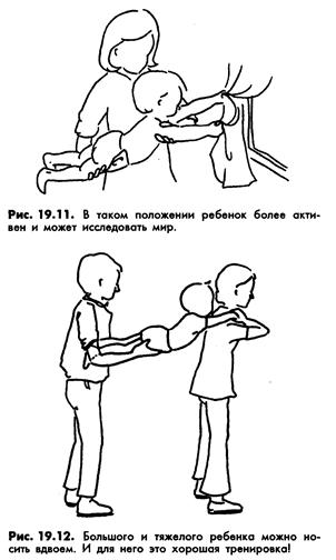 На рис. 19.12 показано, как можно вдвоем носить ребенка постарше, который уже вырос и стал тяжелым, и при этом тренировать его. Ноги ребенка выпрямлены, бедра повернуты наружу, стопы упираются в туловище одного из взрослых. Удерживая его таз снизу ладонями и упираясь большими пальцами рук в ягодицы, взрослый пытается разогнуть ноги малыша в тазобедренных суставах. Если мышцы расслабятся и это удастся, можно попросить его приподнять голову и выпрямить спину. Если же это сделать не удастся, а малыш сводит ноги и ротирует их внутрь, держать его таким способом не следует.