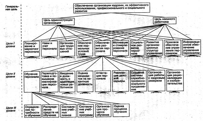 Социальная цель — обеспечение организации кадрами, их эффективного использования, профессионального и социального развития. Для каждой из этих целей можно построить дерево целей.