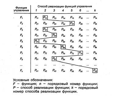 Морфологический анализ - средство изучения всевозможных комбинаций вариантов организационных решений, предлагаемых для осуществления отдельных функций управления персоналом. Если записать столбиком все функции, а затем против каждой из них построчно указать всевозможные варианты ее выполнения, то получим морфологическую матрицу (рис. 4), используемую для нахождения оптимального решения. Идея метода заключается в том, чтобы сложную задачу разбить на мелкие подзадачи, которые легче решать по отдельности. При этом предполагается, что решение сложной задачи складывается из решений подзадач.