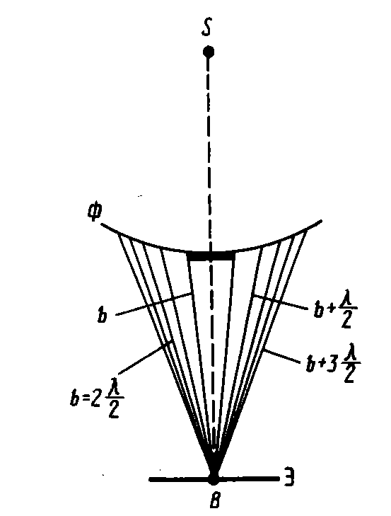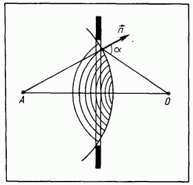 зонах Френеля, укладывающихся в отверстии, равна освещенности, создаваемой совместным действием внутренней половины первой зоны и наружной половины последней. Если отверстие в экране велико, то угол а между нормалью к волновому фронту у края отверстия и направлением